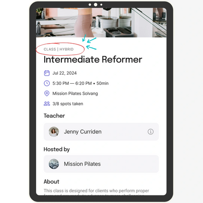 Mission Pilates is now offering live virtual classes so that you can join in from anywhere with Wifi! Join our small group classes at our Solvang or Orcutt studios for Reformer, Bounce, Barre, Mat, or Dance classes through our system via the zoom app! Our scheduling system makes it extremely simple by allowing you to schedule a virtual class the same way you would an in person class, then simply click a link sent to you via email to start the video when class begins! Just look for the "Online" or "Hybrid" option listed on the class, to see if that class is available to join virtually! You can now be a part of Mission Pilates no matter where you are